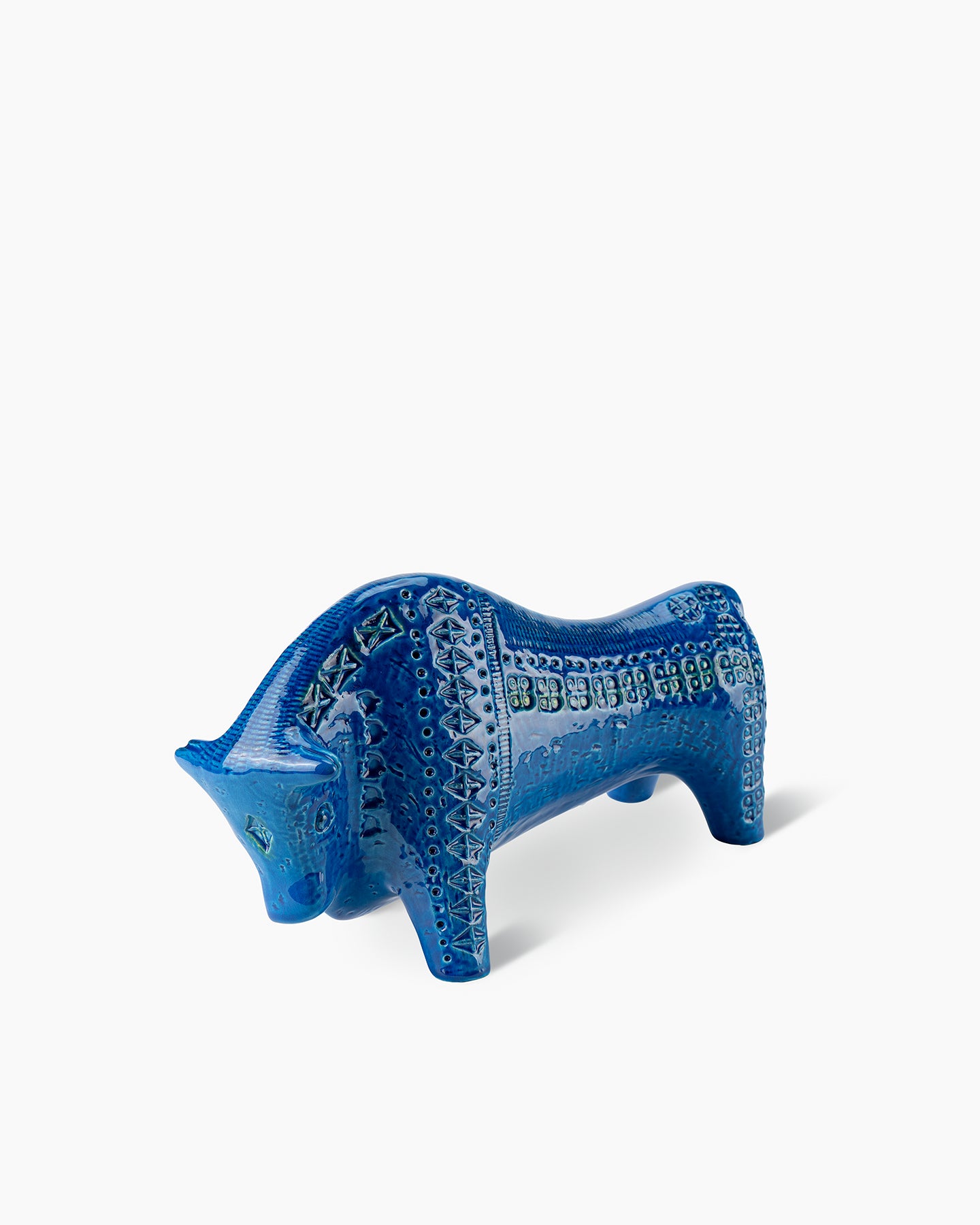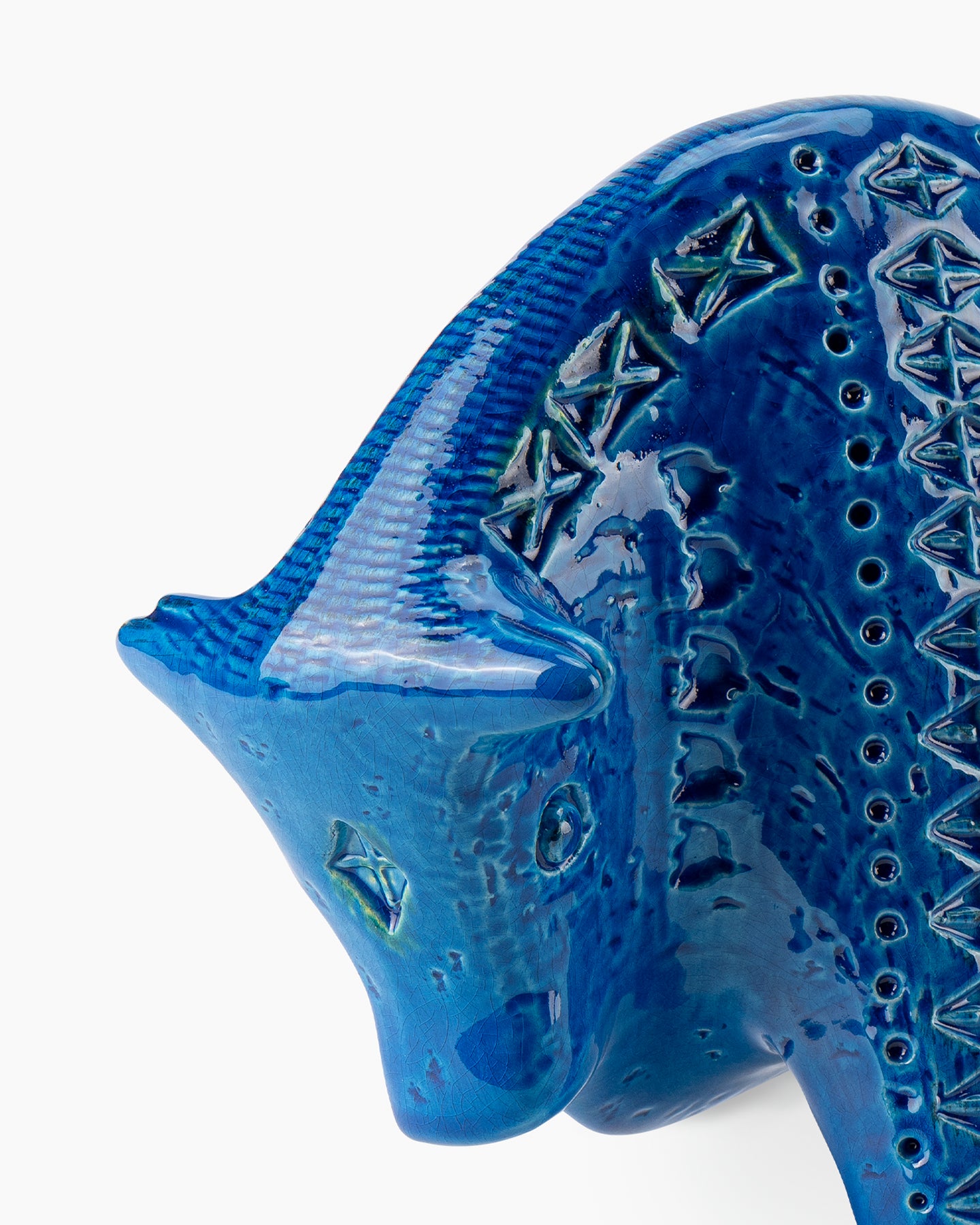 The iconic Rimini Blu series, produced since 1959, stands out for its distinctive surface texture. The decoration—made up of markings that form a fantastical round dance of abstract-geometric elements, sealed beneath the blue glaze—evokes the play of light on the surface of the sea.