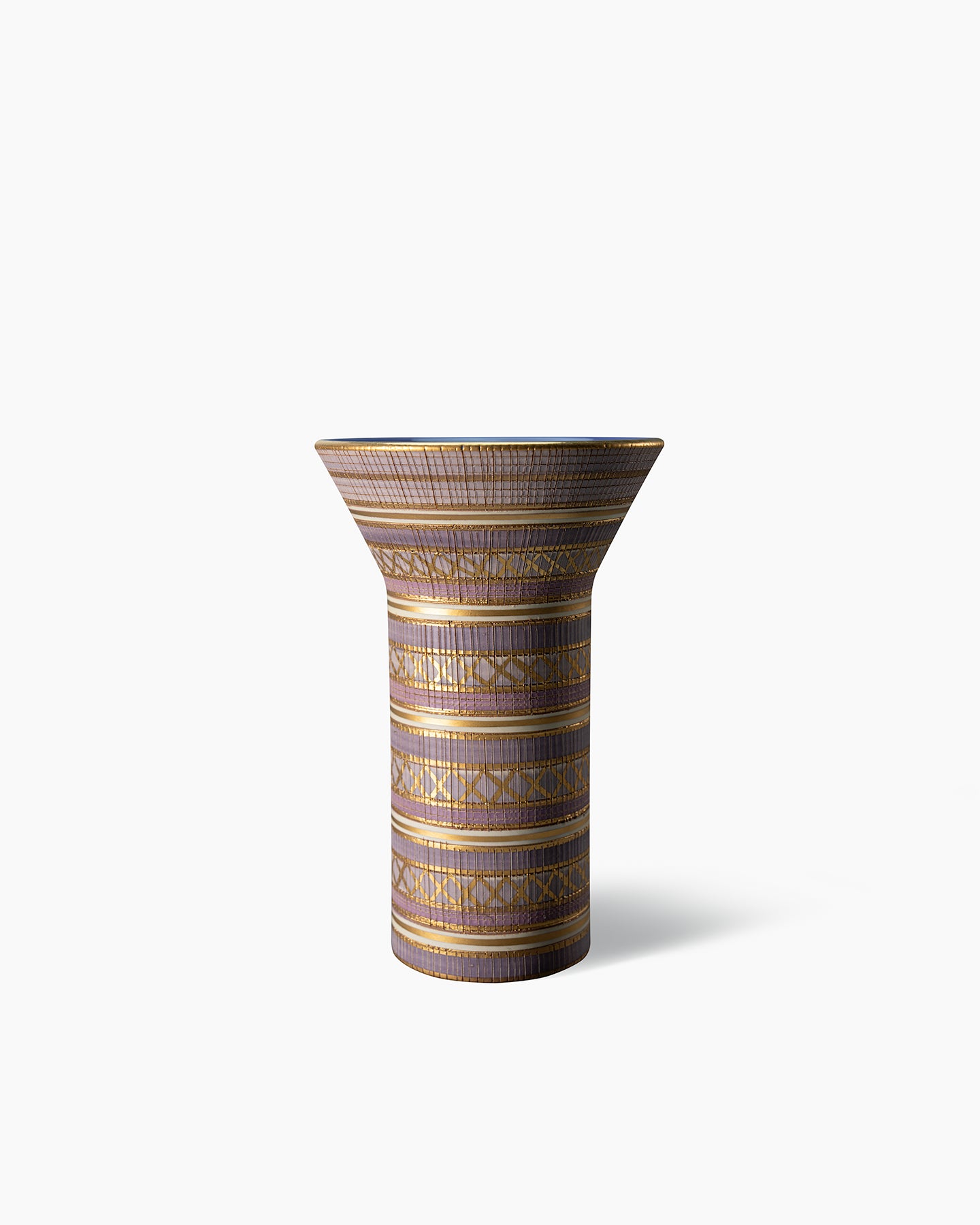 Shape made on the wheel using red clay. "Seta" series with vertical combed incisions. Decorated with colored bands in lilac, pink, and violet, and finished with gold details using third-firing technique. Interior glazed in glossy purple.