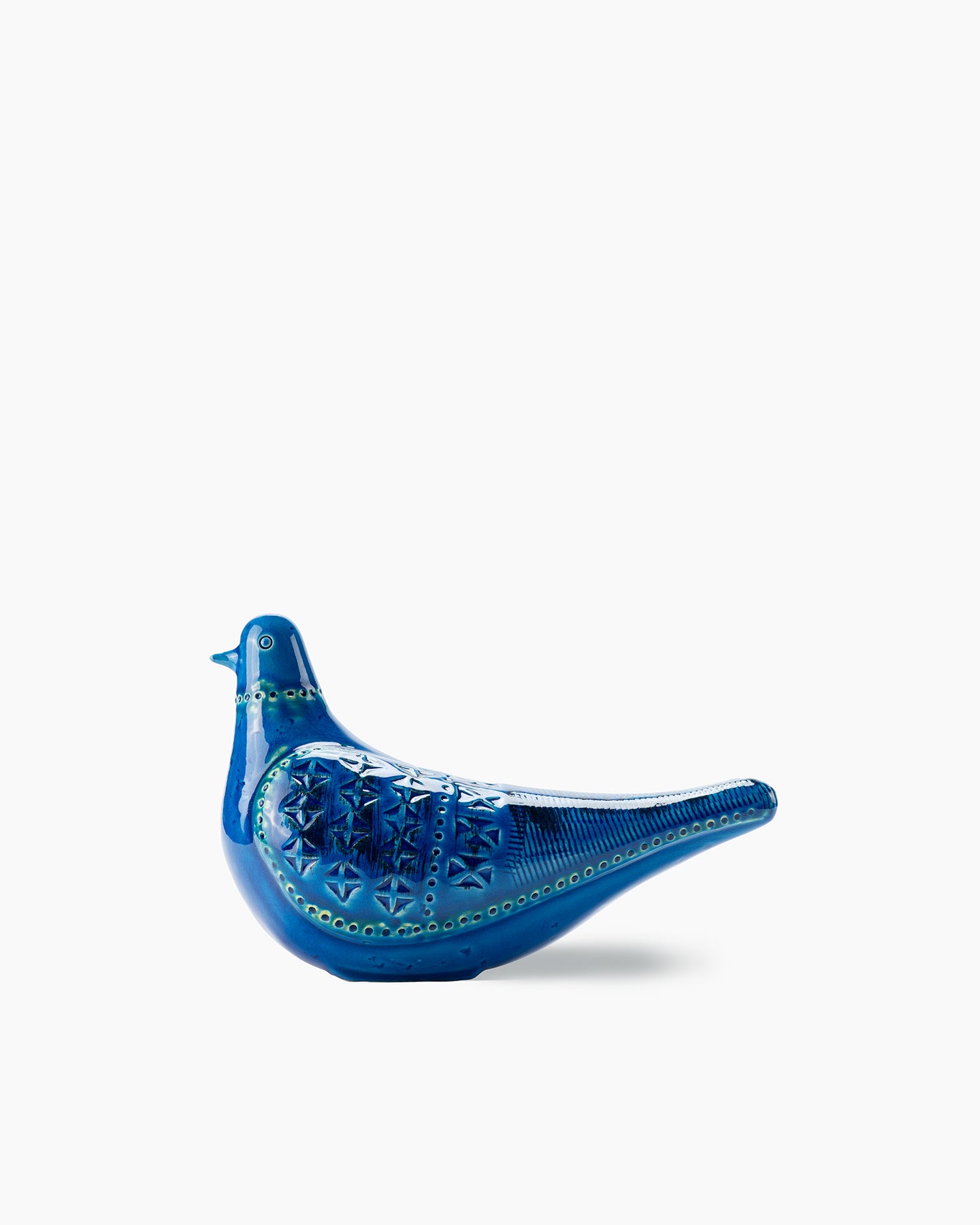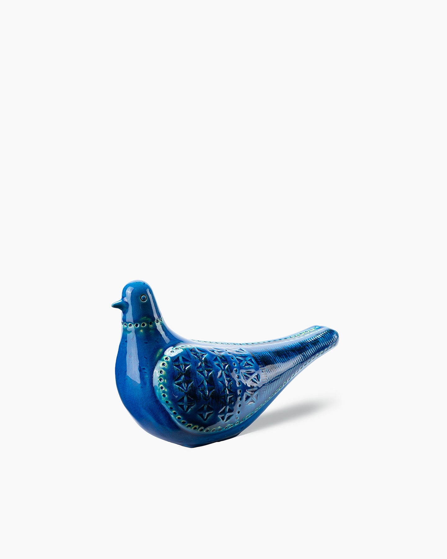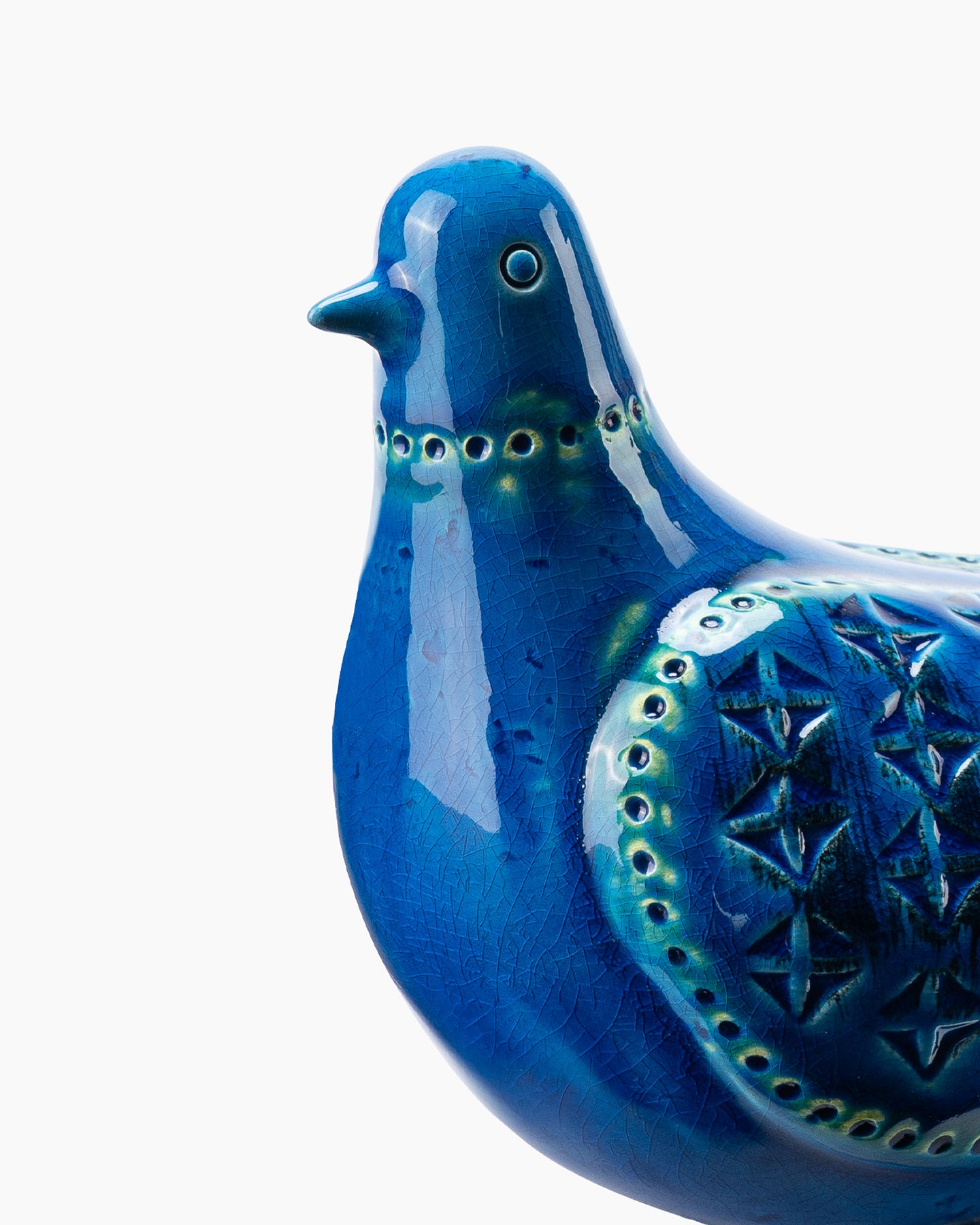 The iconic Rimini Blu series, produced since 1959, stands out for its distinctive surface texture. The decoration—made up of markings that form a fantastical round dance of abstract-geometric elements, sealed beneath the blue glaze—evokes the play of light on the surface of the sea.
