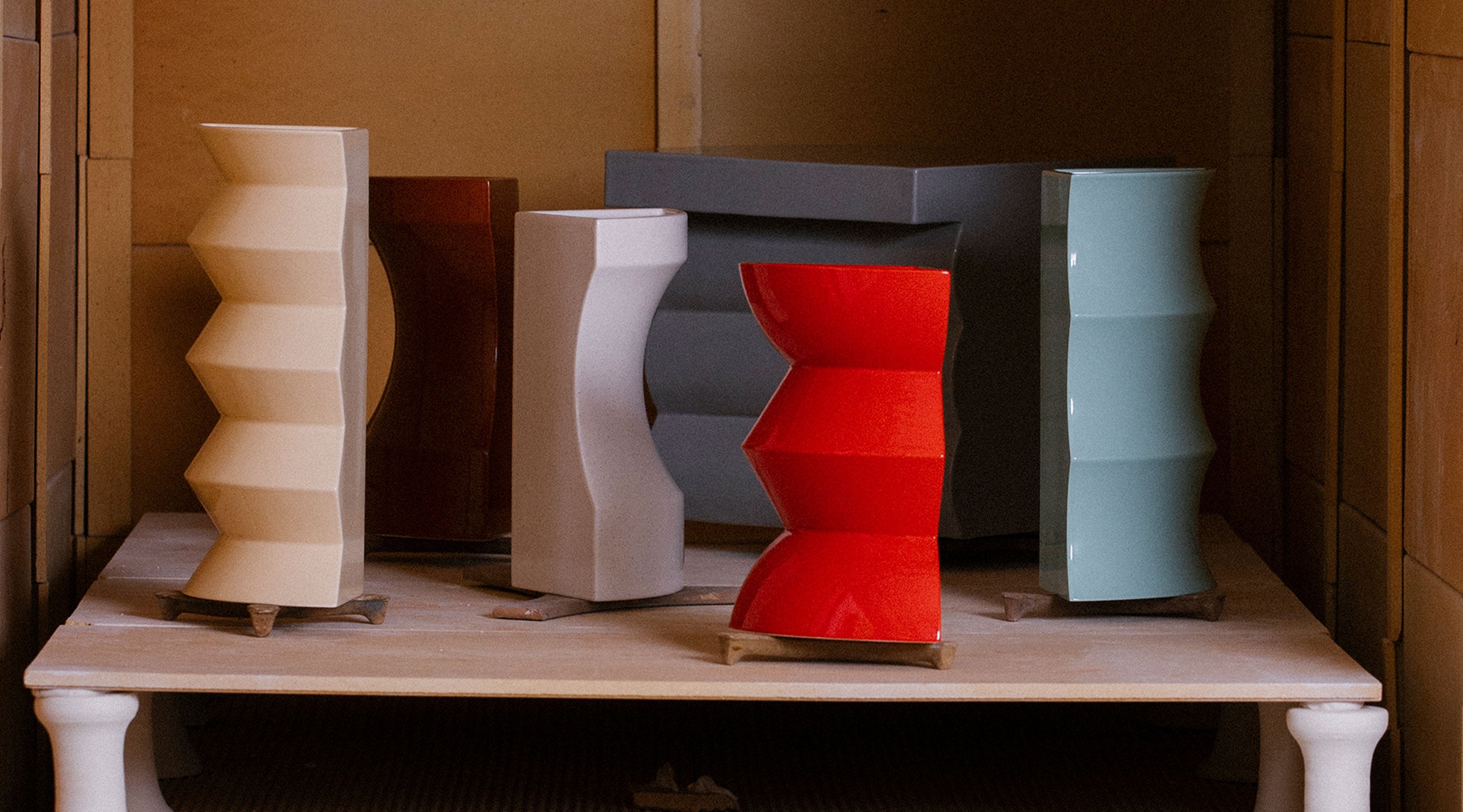 Both projects, produced in 2024, invite the combination of two or more elements in contrasting tones to create a dynamic landscape within domestic spaces. Crafted using the slip-casting technique in white clay and finished with glossy glaze.