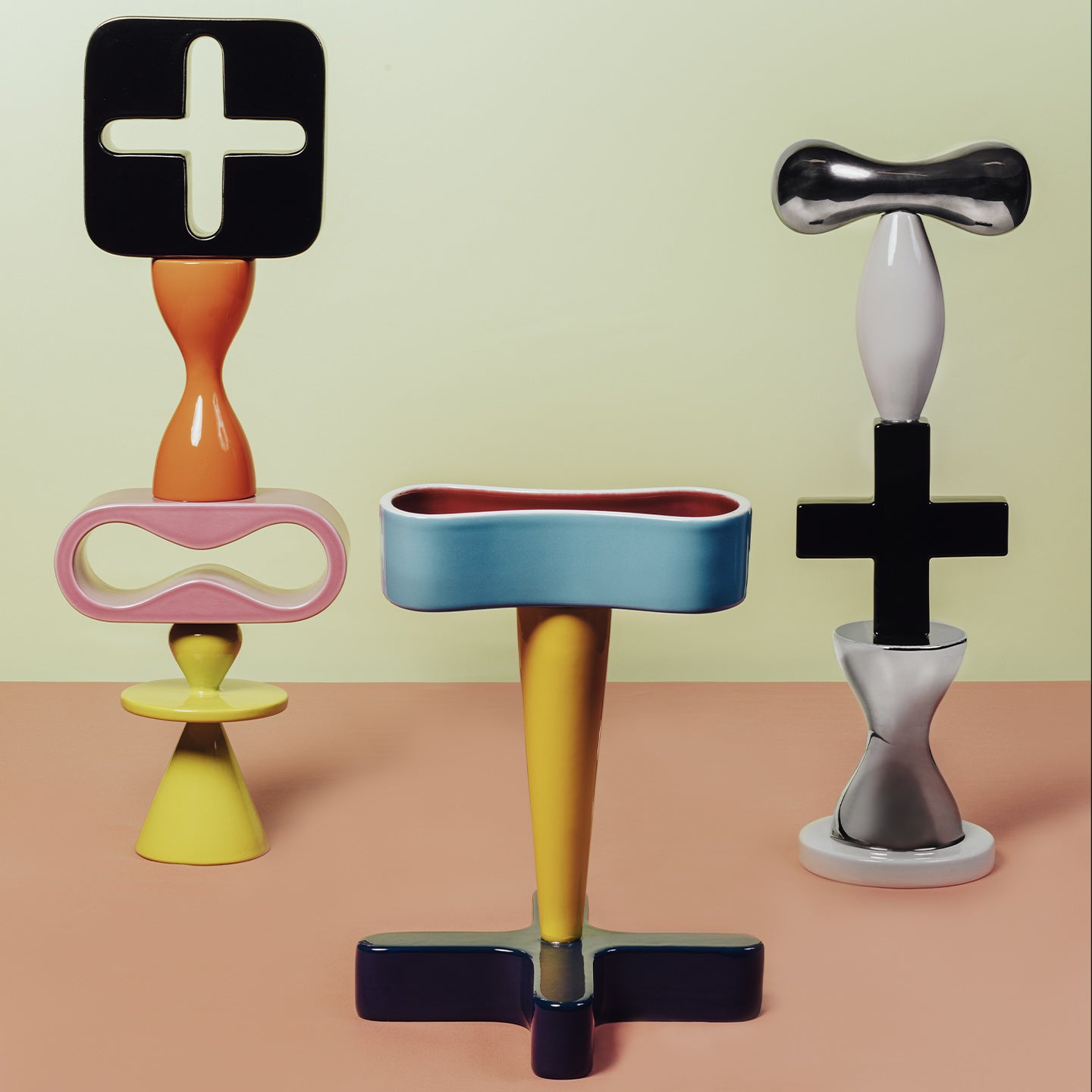 Una serie bizzarra e futuristica dai colori magnetici. In un’alternanza di Pantoni inediti, dal fucsia al verde pistacchio, dal giallo canarino all’argento, gli elementi si susseguono componendo forme simboliche, ciascuno rivestito da smalti brillanti, alcuni dei quali con decalcomanie.