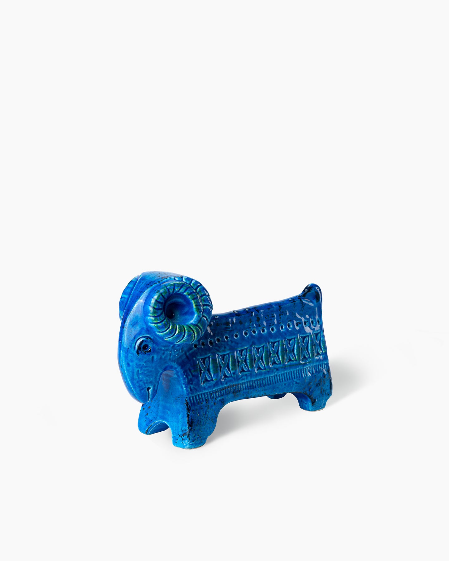 Miniatura figura di montone serie Rimini Blu. Realizzato a colaggio in terra bianca. Decoro eseguito con incisione manuale a stampino con motivi diversi sull'argilla fresca, sotto cristallina azzurra brillante.