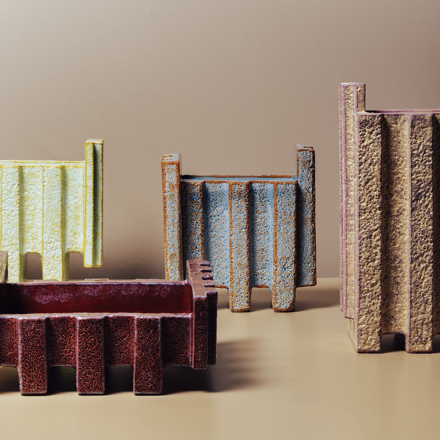 Una serie di micro-architetture che si differenziano tra loro per le forme irregolari e testurizzate, ispirate agli elementi costruttivi tipici dei progetti edilizi. Ogni vaso è concepito come un’opera d’arte, e riflette l’irregolarità e la complessità tipiche delle strutture architettoniche.