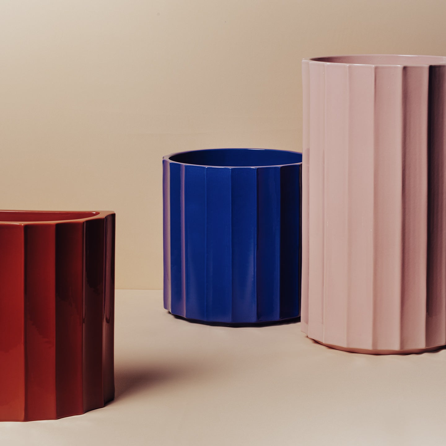 Una collezione che celebra il patrimonio classico della storia dell’arte, in un dialogo tra culture che si ispira alle produzioni fittili comuni alla Grecia e all’Italia antica. La collezione presenta tre vasi cilindrici impilabili e due semicilindrici da parete, scanalati come le colonne classiche.