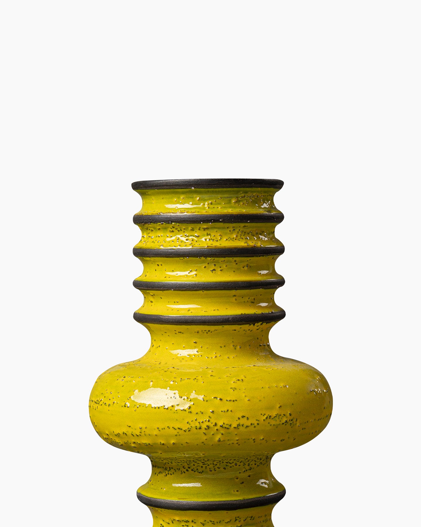 Vaso eseguito a colaggio in terra bianca. Cristallina gialla sopra engobbio marrone. L’engobbio è un colore a base argillosa che viene steso sulla superficie ceramica ancora cruda. La superficie ruvida è data dalla presenza di granella di sabbia all’interno dell’engobbio.