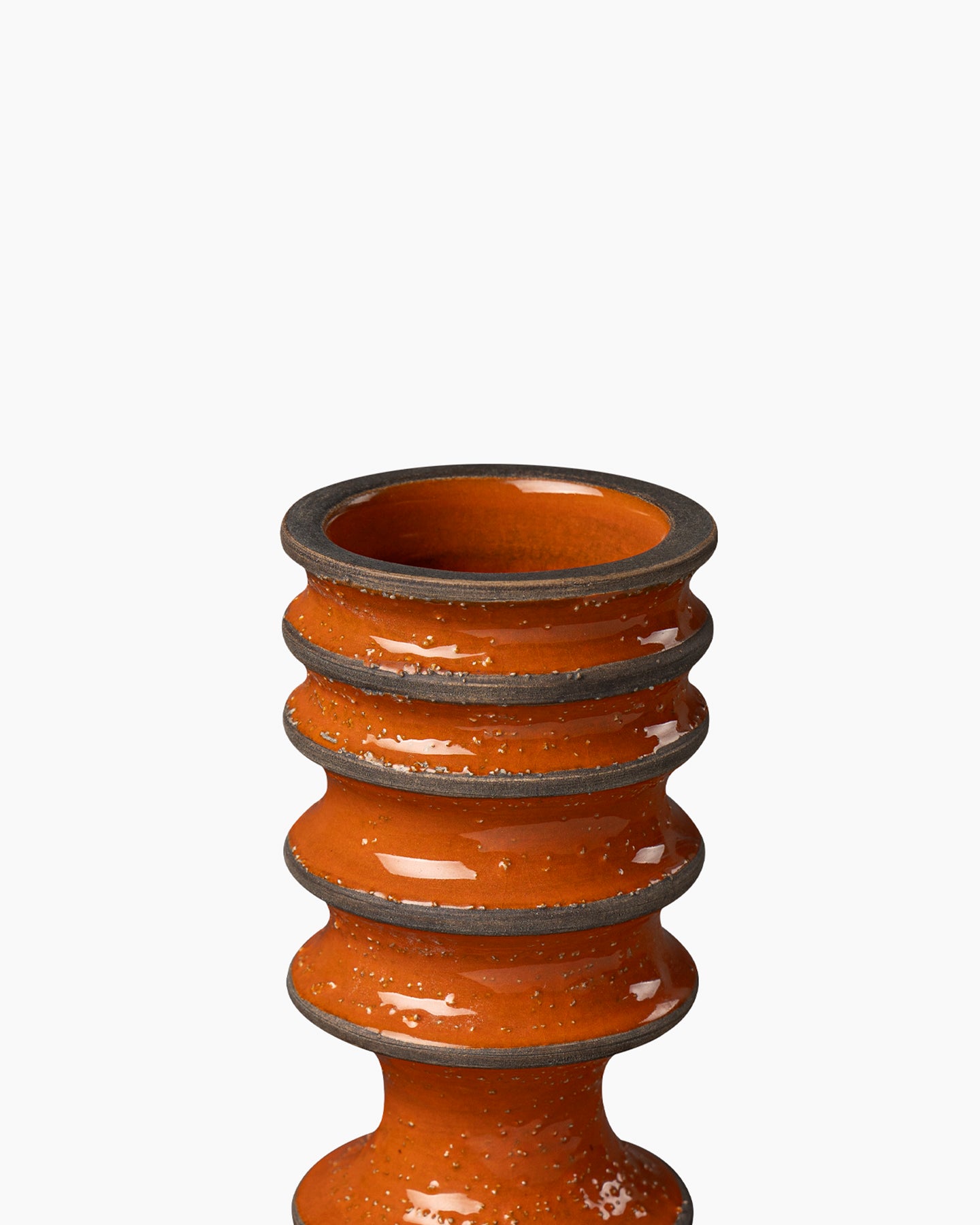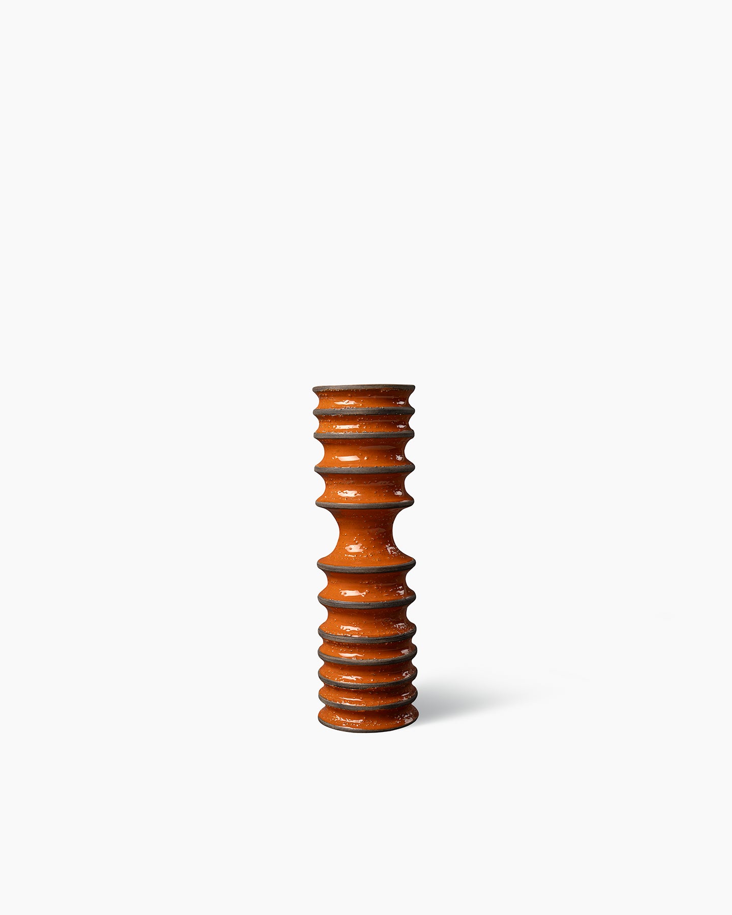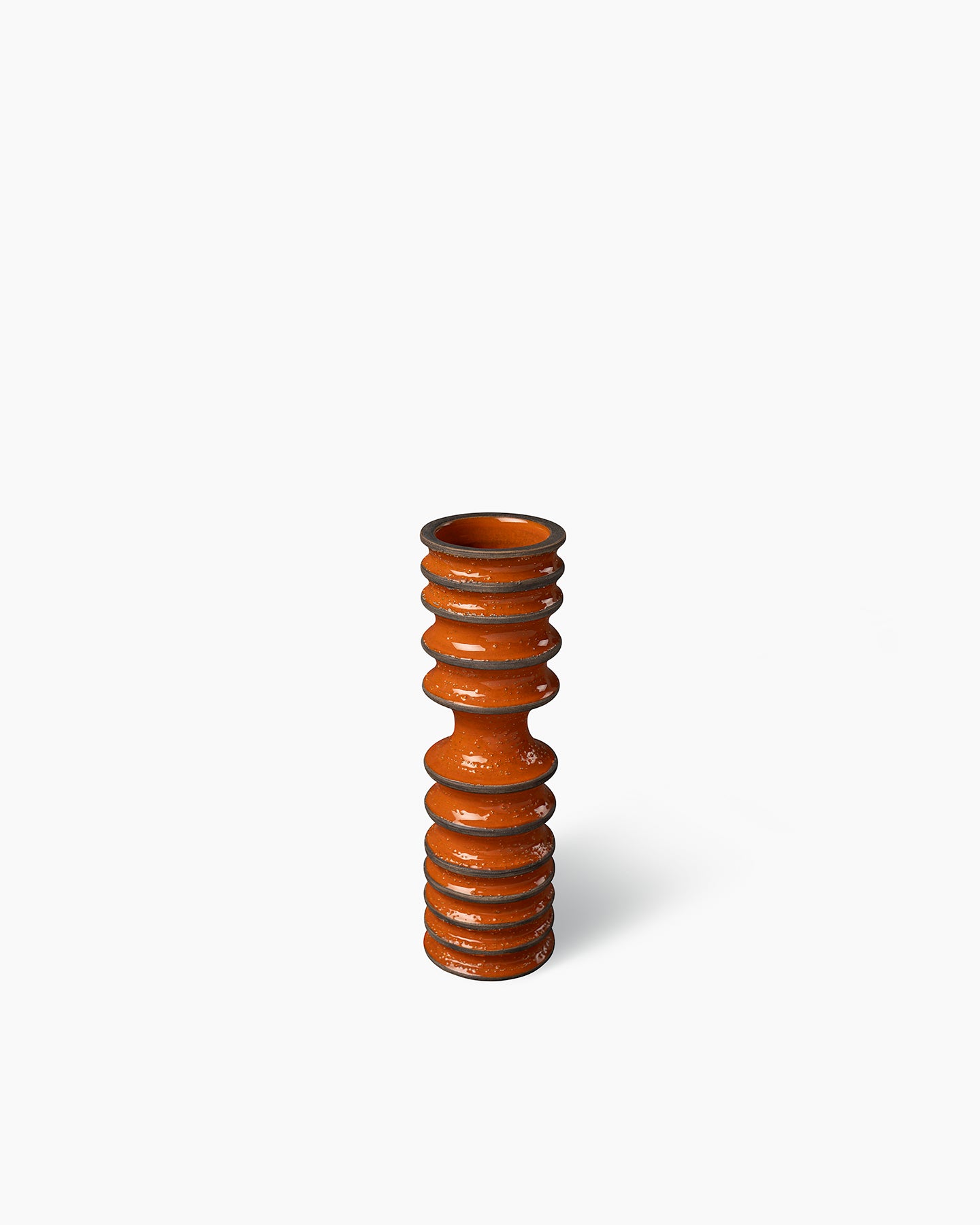 Vaso eseguito a colaggio in terra bianca. Cristallina arancio sopra engobbio marrone. L’engobbio è un colore a base argillosa che viene steso sulla superficie ceramica ancora cruda. La superficie ruvida è data dalla presenza di granella di sabbia all’interno dell’engobbio.
