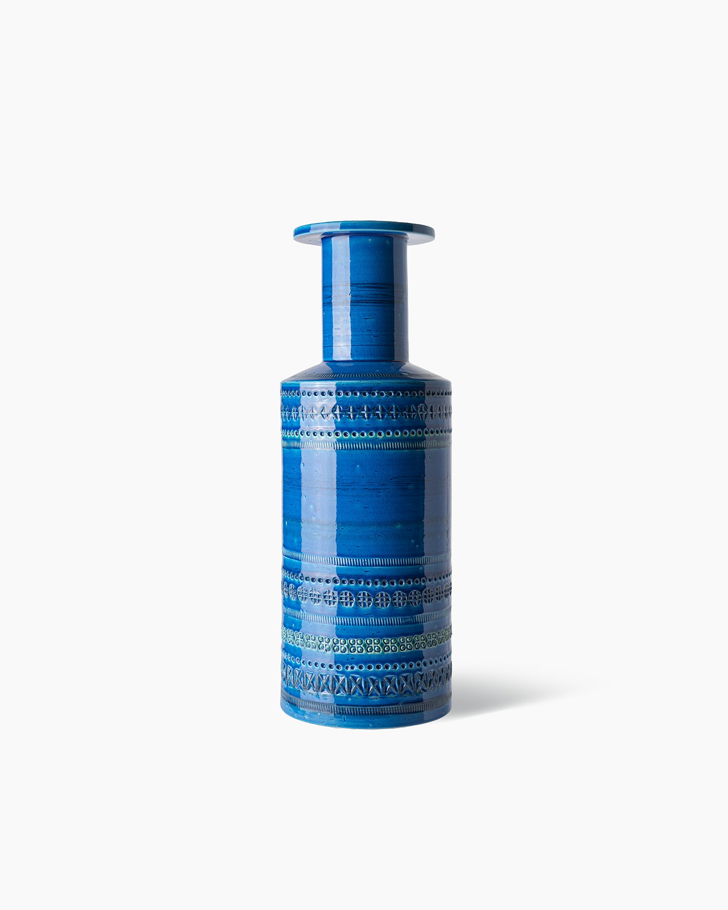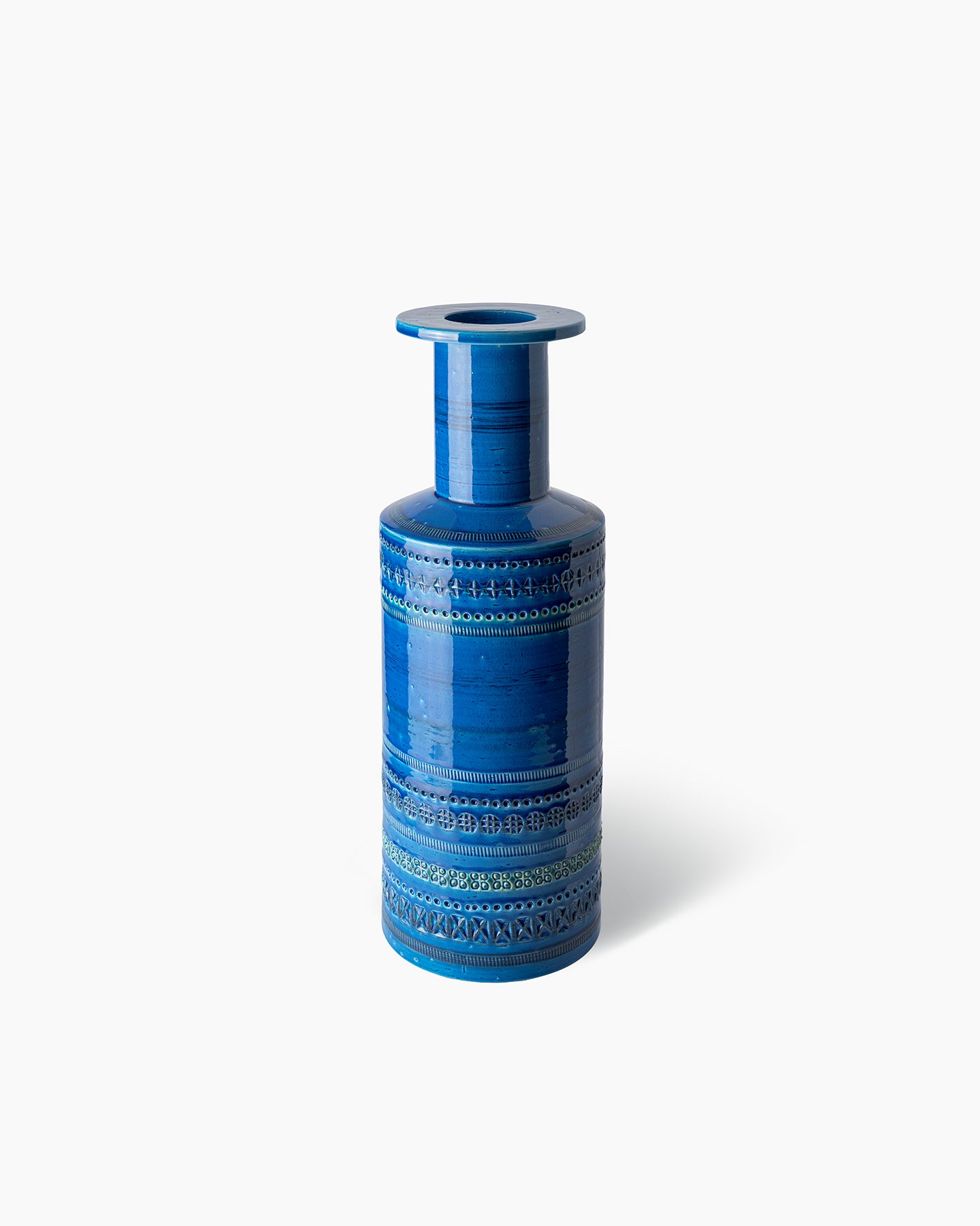L’iconica serie Rimini Blu, prodotta dal 1959, si distingue per la texture della superficie. La decorazione, composta da segni che creano un girotondo fantastico di elementi astratto-geometrici fissati sotto il blu, ricorda i giochi di luce sulla superficie del mare.